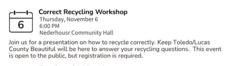 Join us on at Nederhouser Hall in Olander Park for a presentation on how to properly recycle.